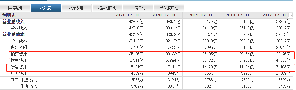 海信视像的财报显示,2022年三季度,销售费用为24.19亿元,是研发费用的1.6倍,2021年销售费用为35.36亿元,是研发费用的1.9倍,2020年销售费用为33.33亿元,是研发费用的1.9倍,近三年销售费用几乎都是研发费用的2倍左右,2022年前三季度虽然下滑至1.6倍,但依然是家“重营销,轻研发”的科技公司。