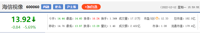 世界杯开幕前一个交易日,海信视像(沪A600060,海信电视的母公司)的收盘价为14.36元/股,截至12月12日,海信视像的股价为13.92元/股,总市值179.3亿元。股价当日下跌5.69%,较世界杯开幕前一日的股价同样下跌了3.1%。
