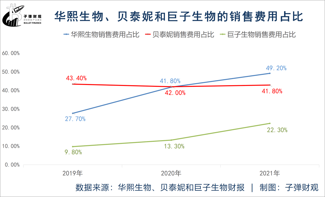 2019-2021年,华熙生物、贝泰妮和巨子生物的销售费用占比如下图所示。