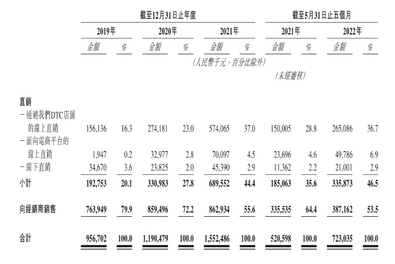 不过,在盈利能力以及先发优势之外,巨子生物也是一众护肤品公司中,离消费者最远的公司之一。早期公司以线下医疗机构及分销为主,之后逐步加大直营比例,到2022年前5月,直营渠道占比提升至46.5%,不到一半。
