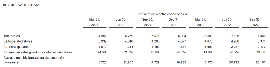 瑞幸的复苏过程就常常被用来支撑起这套论述逻辑。以最新的财报数据为例,2022财年Q3季度瑞幸净收入达到38.95亿元,实现同比增长65.7%。其中净利润为5.29亿元,月均交易客户数同比增长70.5%,达到2510万人次——而这些数据增长的主要来源指向了“加盟(联营)”模式,财报提及瑞幸截至第三季度拥有5373家自营门店和2473家联营门店,其中联营门店贡献的净收入约为8.99亿元,同比拉升幅度达到了116.1%。应景的是,第三季度运营开支占净营收的比例下降到了138.3%,远远低于2018年“暴打资本主义韭菜”时代的301.7%。