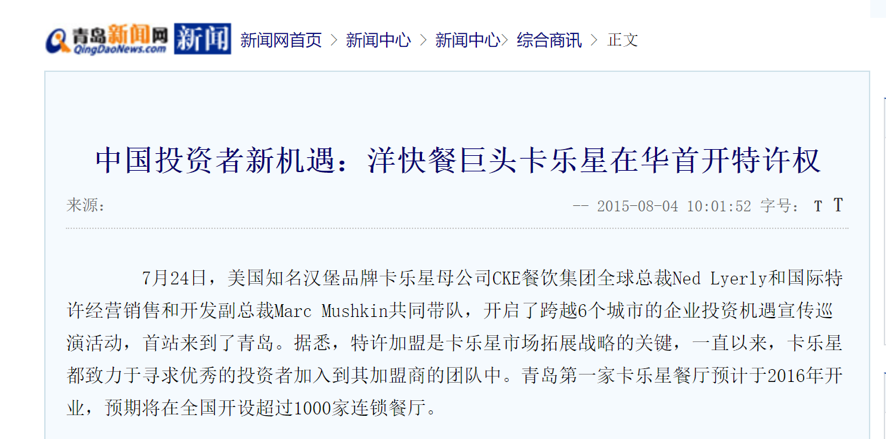 在中国市场总共13年的经营时间里,卡乐星出现在公开报道里的发展愿景无一例外都来自于加盟商。“8年100家”“全国1000家”这两个最常被行业媒体引用的数字,分别来自星界晖举办的首店新闻发布会、2016年CKE在青岛举行的企业投资机遇宣传巡演。