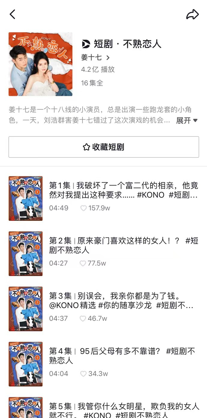 甚至为广告主定制短剧,已经成为了新的营销模式。今年9月,MCN机构银色大地与洗护品牌KONO合作的定制短剧《不熟恋人》在抖音上线,三天播放量就破亿。在剧情设置中,将女主角的妈妈职业定为开理发店的,也让广告的露出更加自然。除了在剧情中露出KONO洗发水外,在视频下方的小黄车中甚至直接挂了女主同款洗发水的链接。