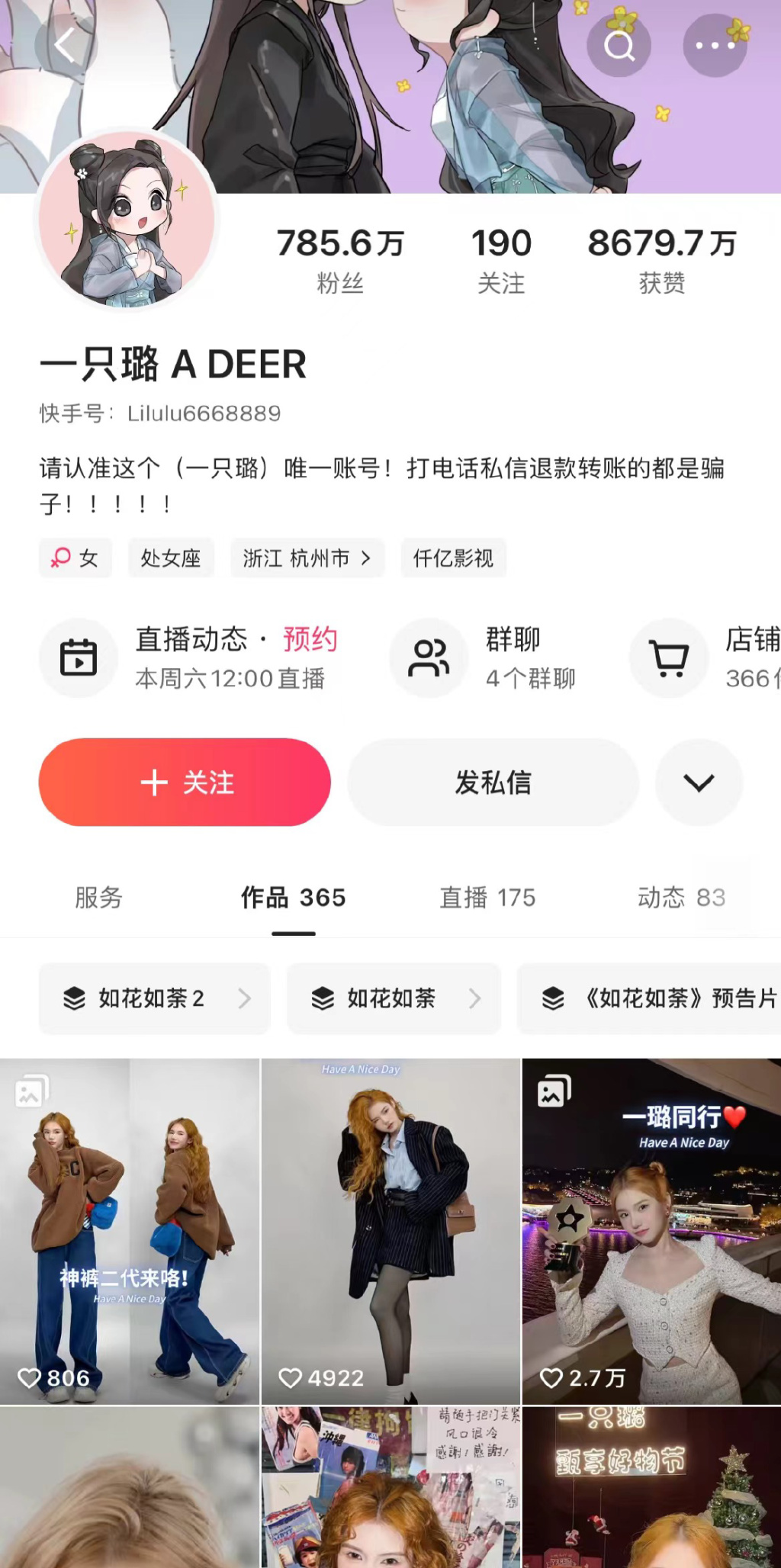 以快手的“一只璐”为例,她主演的多部短剧在平台爆火,其中《这个男主有点冷》播放量突破了10亿,快手账号@一只璐 涨粉超过500万。这也让她的直播带货有了爆发性增长,与2021年相比,直播带货GMV增长近千倍。
