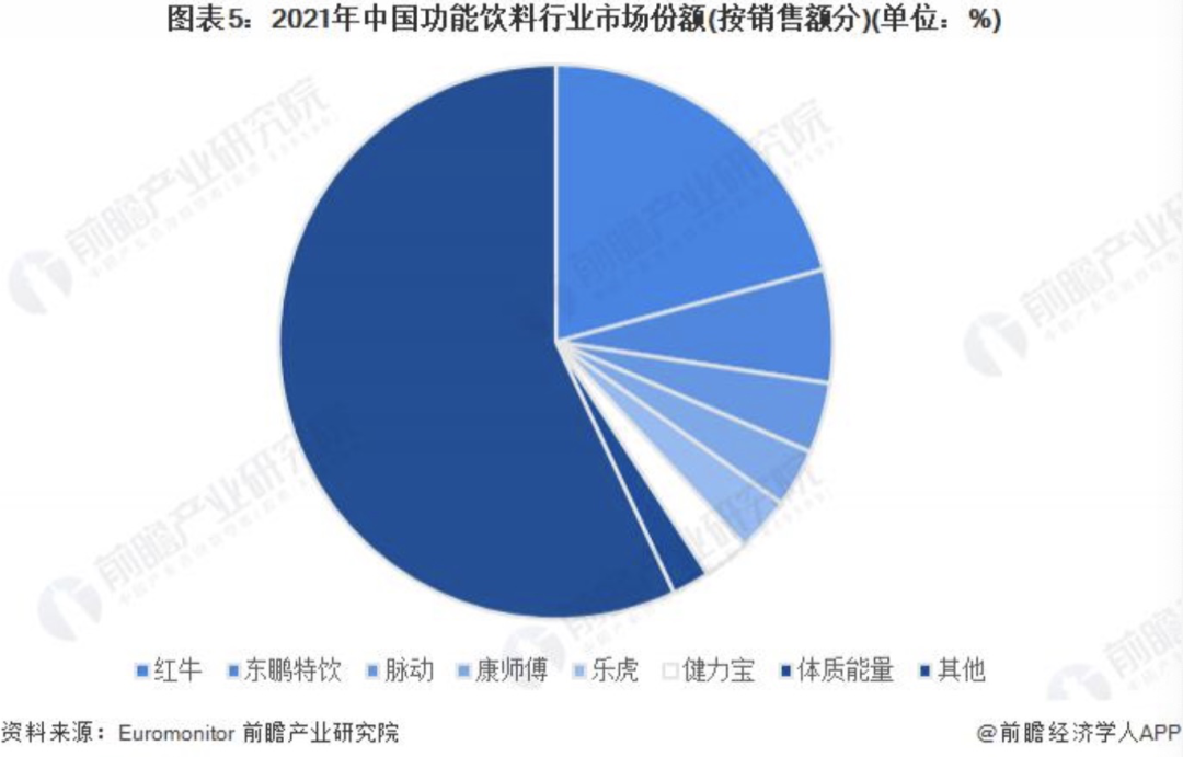 根据 Euromonitor 公布的数据,2021 年中国功能饮料行业中,红牛占据着 20.8%的市场份额,是我国功能饮料行业的龙头企业,东鹏特饮以 6.6% 的市场份额排在第二位,紧随其后的是脉动、康师傅、乐虎、健力宝和体质能量。