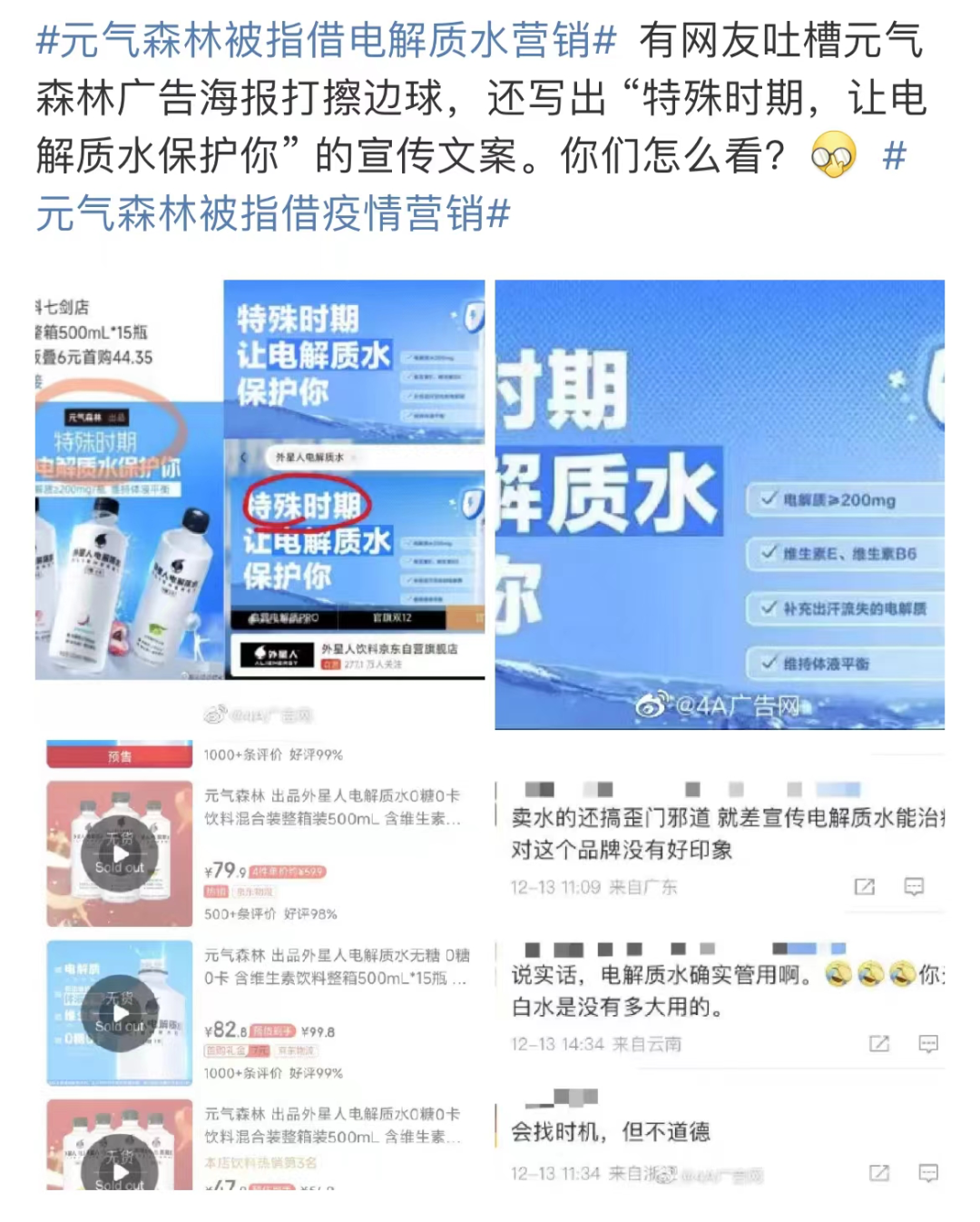 但“枪打出头鸟”。自媒体“品玩”称,元气森林旗下品牌外星人电解质水,曾在其线上官方旗舰店与线下经销商体系等渠道的宣传资料中打出“特殊时期,让电解质水保护你”的宣传语。不过,截至发稿前,其京东官方旗舰店及淘宝旗舰店已找不到此宣传语。