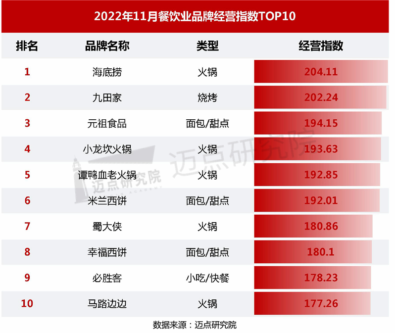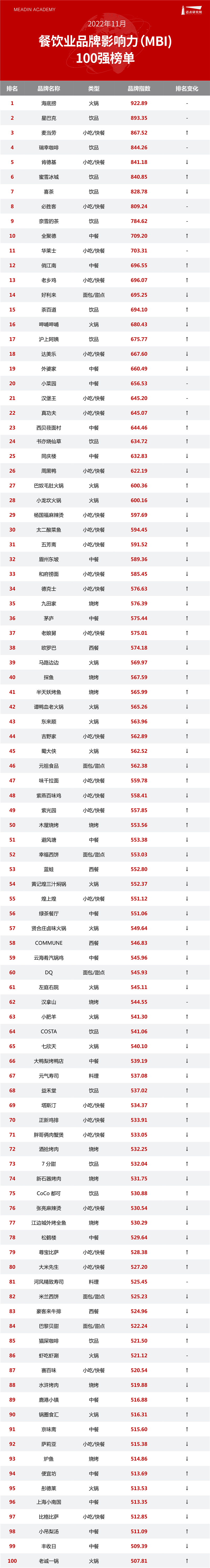 以下是迈点研究院独家发布的“2022年11月餐饮业品牌影响力(MBI)100强榜单”。本月海底捞、星巴克、麦当劳、瑞幸咖啡、肯德基、蜜雪冰城、喜茶、必胜客、奈雪的茶、全聚德进入榜单前十。TOP10品牌中,饮品品牌热度依然最高,占5席;其次是小吃/快餐品牌占3席,而火锅和中餐品牌各占1席。相比10月,本月100强榜单中,共有40个品牌排名上升,49个品牌排名下降,11个品牌排名没有变化。