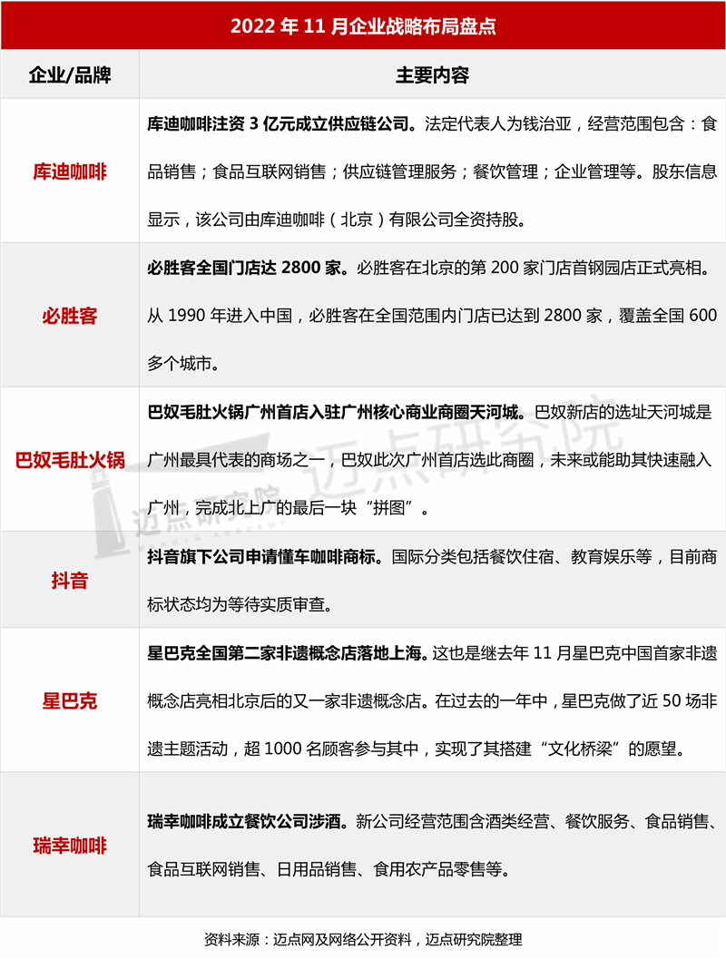 企业战略布局方面,本月饮品赛道布局仍然最为积极。库迪咖啡、星巴克、瑞幸咖啡等饮品品牌迎来战略布局新动态。库迪咖啡注资3亿元成立供应链公司,星巴克全国第二家非遗概念店落地上海,瑞幸咖啡成立餐饮公司,抖音旗下公司申请懂车咖啡商标。