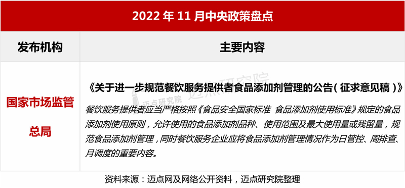 本月,预制菜和食品安全方面的政策备受关注。预制菜方面,随着预制菜产业的火爆,不少企业竞相入局,各地相继出台支持政策。其中山东和福建出台的措施明确:打造预制菜产业集群,完善具有当地特色的预制菜标准体系,培育壮大预制菜龙头企业,支持仓储冷链建设和搭建预制菜公共服务平台。食品安全方面,市场监管总局进一步规范食品添加剂的管理,上海升级外卖食品安全封签管理办法。