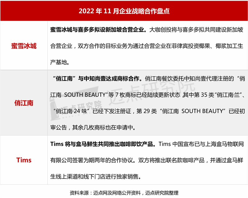 另外,战略合作方面,由于疫情使得线上消费场景增加,供应链和渠道方面的规划对餐饮企业尤为重要。蜜雪冰城的全资持股子公司大咖创投将与喜多多共同建设新加坡合营企业。喜多多和大咖创投共同控制合营企业,通过合营企业在菲律宾投资椰果、椰浆加工生产基地。交易后,喜多多直接或间接持有合营企业51%股权,大咖创投直接或间接持有合营企业49%股权。可以看出,蜜雪冰城在不断加大在供应链上的战略部署和规划,尝试减少对鲜活饮品等原料供应商的依赖。而Tims将与盒马鲜生将推出联名款咖啡产品,并通过盒马鲜生线上渠道和线下门店进行独家销售。此次合作是Tims咖啡探索消费新场景的又一延伸,通过盒马鲜生的线上和线下的渠道,触达更多元的消费者。