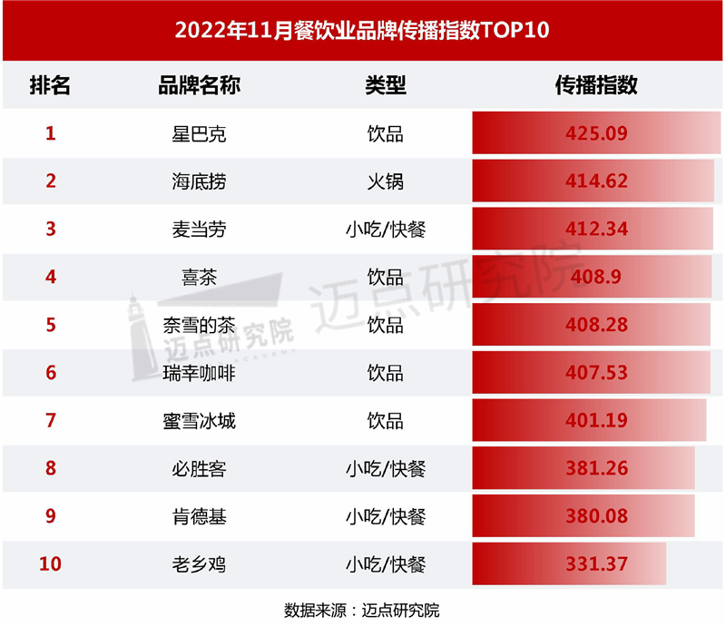从餐饮业品牌的传播指数来看,11月,传播指数排名前十的品牌依次是:星巴克、海底捞、麦当劳、喜茶、奈雪的茶、瑞幸咖啡、蜜雪冰城、必胜客、肯德基、老乡鸡。其中,传播指数重点关注品牌为老乡鸡,其传播指数达到331.37,传播指数环比上升14.36%;排名位于传播指数第10位。