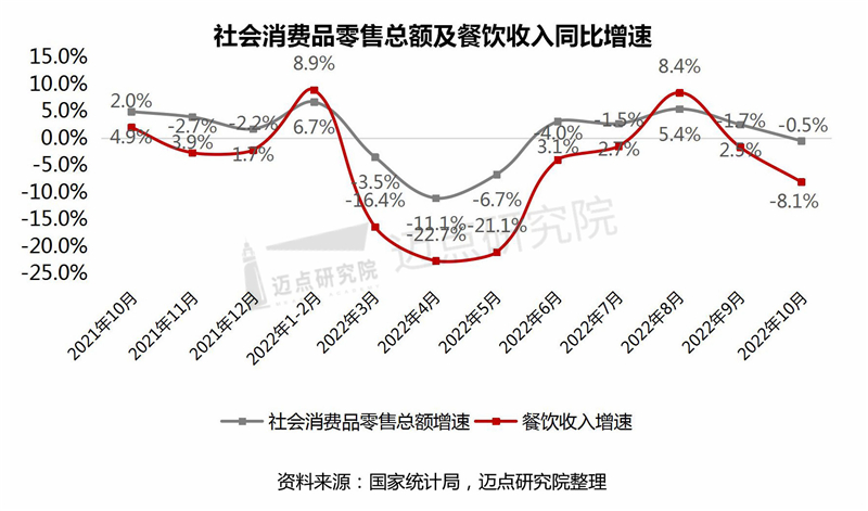 10月份,国家统计局数据显示,社会消费品零售总额40271亿元,同比下降0.5%;餐饮收入4099亿元,同比下降8.1%;限额以上餐饮收入978亿元,同比下降7.7%。2022年1-10月份,社会消费品零售总额360575亿元,同比增长0.6%;全国餐饮收入35348亿元,同比下降5%;限额以上餐饮收入8832亿元,同比下降4.3%。