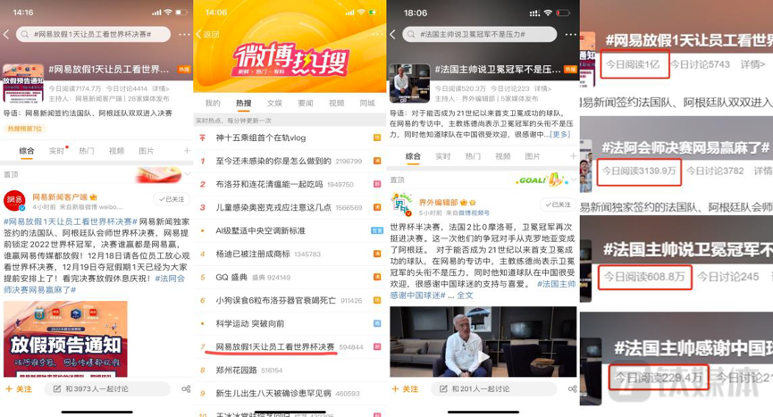 2018年俄罗斯世界杯,网易传媒就和法国队合作紧密,最终以“全员放假一天”的创意方式,庆祝合作伙伴夺冠。2022年7月,网易传媒宣布再次签约法国队,同时还和阿根廷队牵手成功,不论谁夺冠,网易都“赢定了”,全体员工提前获得了“世界杯假”。消息迅速冲上热搜榜第7位,话题阅读量高达1.3亿,引发一众好评和羡慕嫉妒。