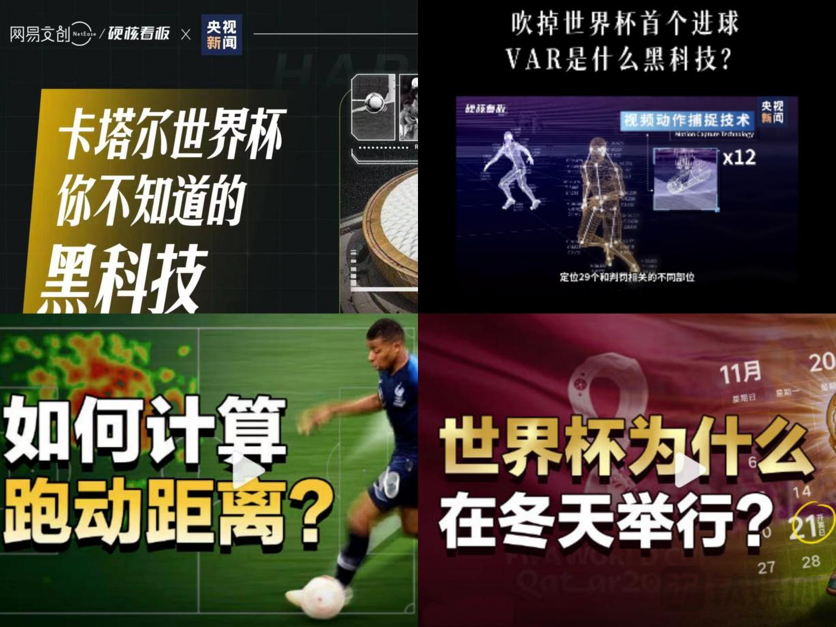 网易文创知识短视频IP“硬核看板”联合央视新闻快速发布动效可视化视频《世界杯首个进球被VAR吹掉!这是什么黑科技》,在央视新闻全渠道上线,央视网体育、环球网、中国日报、虎嗅、36氪等130家媒体跟进报道,冲上微博热搜22位。网易新闻知识短视频IP“解释X-PLAN”发布视频《今年的世界杯为什么在冬天?》,话题阅读量破1.6亿,引发近8000网友讨论,40+家媒体联动传播,微博视频登上全站热门第三位。网易财经推出《解码世界杯》系列视频,深入浅出地拆解世界杯背后的经济账本。网易新闻时尚频道、娱乐频道则围绕世界杯“男模”穿搭等话题展开,以轻量化视频策划开启卡塔尔世界杯的摩登时间。