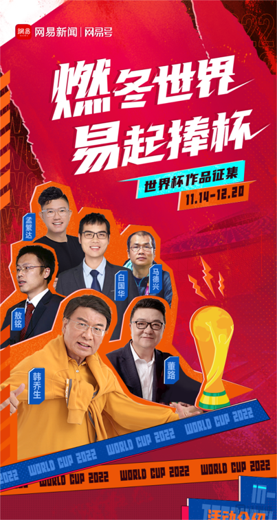 除原创专业赛事内容以外,网易传媒还充分调动平台资源积累,发起面向全平台创作者的“易起捧杯”世界杯作品征集活动,并邀请到80余位足坛名嘴、媒体业界大咖加入内容共创中来。其中,有韩乔生、董路、颜强、马德兴这样的国内知名足评人,也有吴学兰、韩秀云、储殷、吴晓波、周国平这样的各界大咖。目前,活动已产出超过3000篇播放、阅读10w+的图文视频类内容,引发用户端内热议,有近千篇图文跟贴数超过1000条。