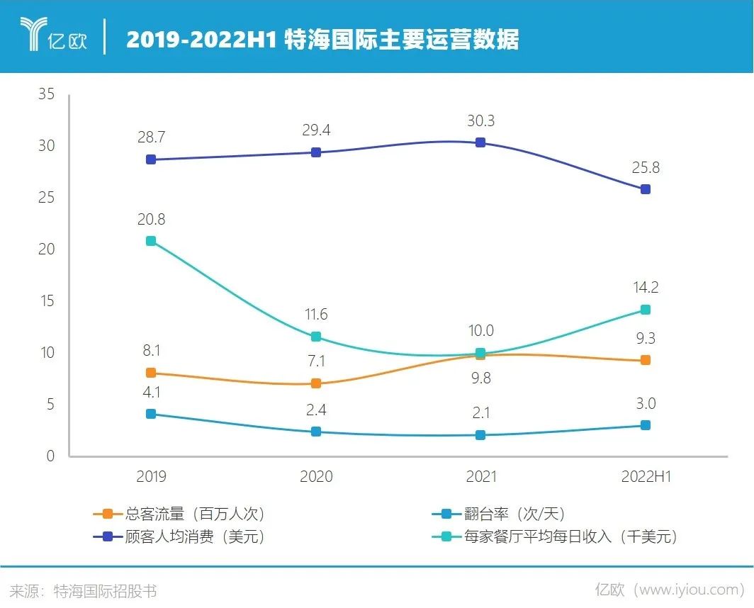招股书显示,2019年特海国际整体翻台率为4.1次/天。尽管疫情期间,公司实施了诸如折扣等一系列措施以提高翻台率,但2020年和2021年的翻台率仍仅有2.4次/天和2.1次/天。