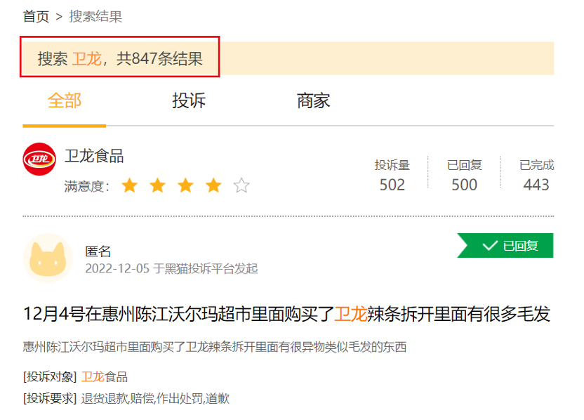 而在第三方投诉平台黑猫投诉上,同样可以看到许多关于卫龙的投诉。例如,有消费者投诉在卫龙拉条中有很多“头发”,甚至还有消费者投诉在卫龙魔芋爽香辣素毛肚中吃出“指甲盖”。此外,还有吃出其他异物、卤蛋发霉、有虫子等投诉情况。