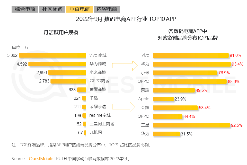 5、数码电商流量居品类垂直细分行业首位,行业玩家多为终端手机厂商,能够以终端用户为自建电商提供流量基础