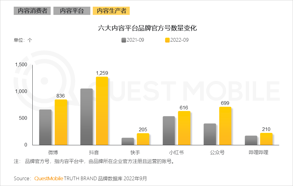 6、KOL合作成本和效果监测等因素驱动下品牌主愈发KOL化,选择直接面向用户,拉近与用户的距离,六大内容平台的品牌官方号数量均有一定幅度的增长
