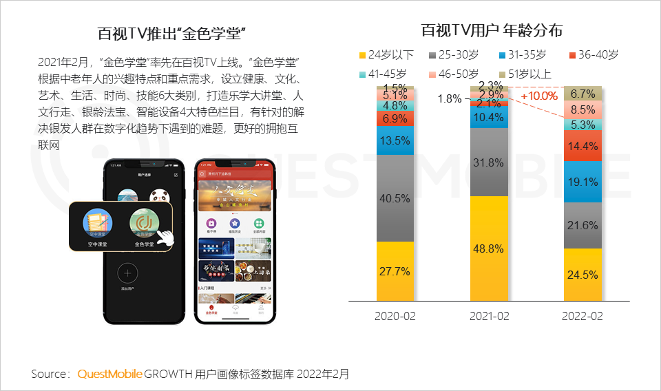6、垂直领域深耕拓展,金色学堂触及50+人群,构建“银发经济”优势,移动端APP用户中51岁以上人群占比提升