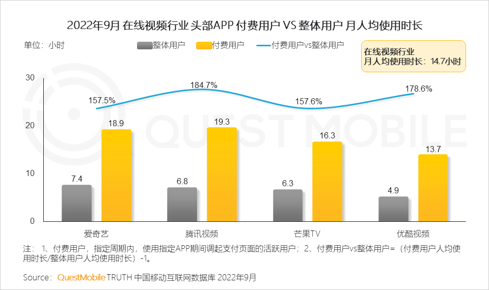 3、从头部APP用户付费情况来看,其付费用户月人均使用时长是整体用户的2-3倍