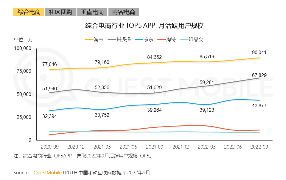 3、综合电商:行业TOP3 APP在月活跃用户规模格局保持稳定