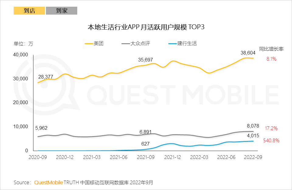 3、典型本地生活APP中,流量规模呈增长趋势,其中美团APP占据大部分流量,格局尽显