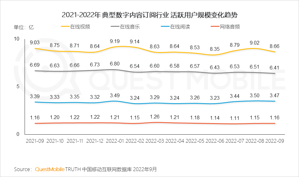 1、在线视频、在线音乐、在线阅读、网络音频构成了数字内容订阅的重要板块;四个行业均以内容为核心交付物,因此更易被“订阅化”