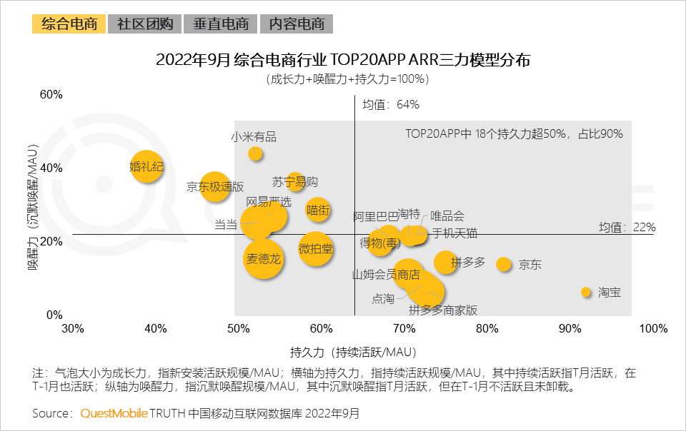 行业TOP20中,有9成的持久力超50%,平均值为64%,此外唤醒力平均贡献22%的活跃用户。