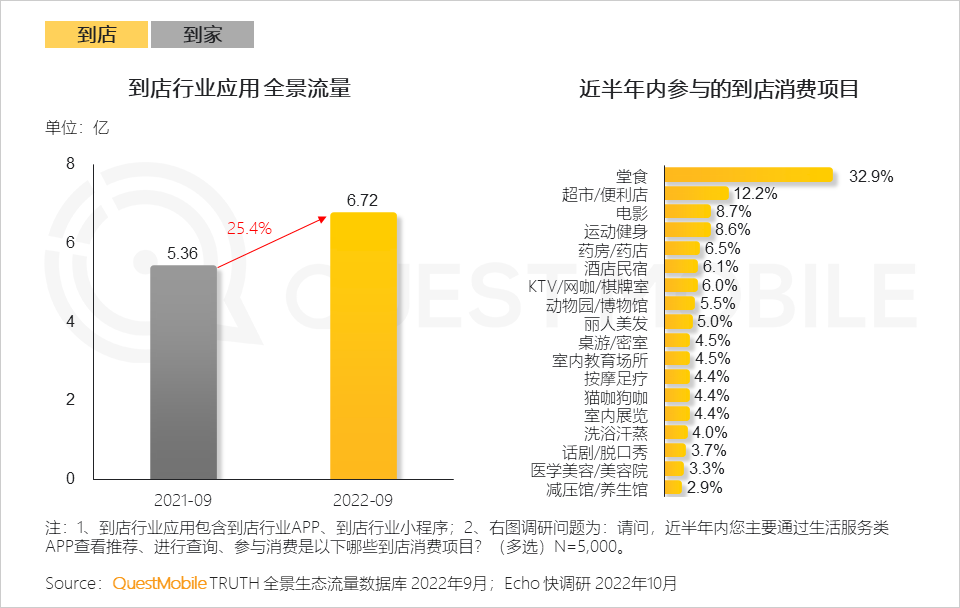 2、数字化经济发展下,到店业务市场规模持续加速,堂食、商超、电影为用户主要的到店消费项目