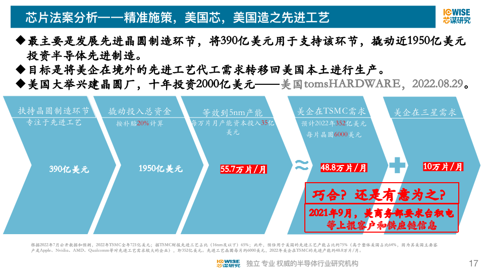 先看半导体数据链有何神通?美国芯片法案扶持先进芯片制造投入的资金是390亿美元,这个数据是怎么来的?按产业规律,政府投入资金一般是总撬动资金的20%,以此计算390亿美元总共可以撬动1950亿美元。等效到5nm工艺的产能,每月万片产能需要资金35亿美元,那么1950亿美元可以形成55.7万片每月的产能,这个产量恰好等于美国企业对台积电和三星所需产能的总和。仅从数字上就能看出,美国这笔钱就是为了实现本土先进芯片的自给自足。