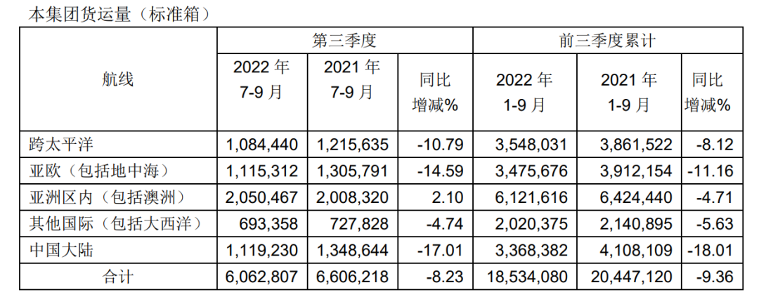 除了亚洲区内航线,其余各大国际航线的货运量均出现了下滑。第三季度,中远海控的跨太平洋航线货运量同比减少10.79%,亚欧(包括地中海)航线货运量同比减少14.59%,其他国际(包括大西洋)航线货运量同比减少4.74%。总体来看,2022年1-9月,中远海控集装箱航运业务的货运量为18,534,080标准箱,较上年同期下降9.36%。