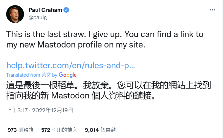 除此之外,在马斯克收购和改造推特过程中一直为其摇旗呐喊的好友 Paul Graham 也「叛离」了。Paul Graham 是知名创业公司孵化器 Y Combinator 的创始人,在最新发布的推文中指出,他将放弃推特,并引导用户去找 Mastodon 的个人链接。