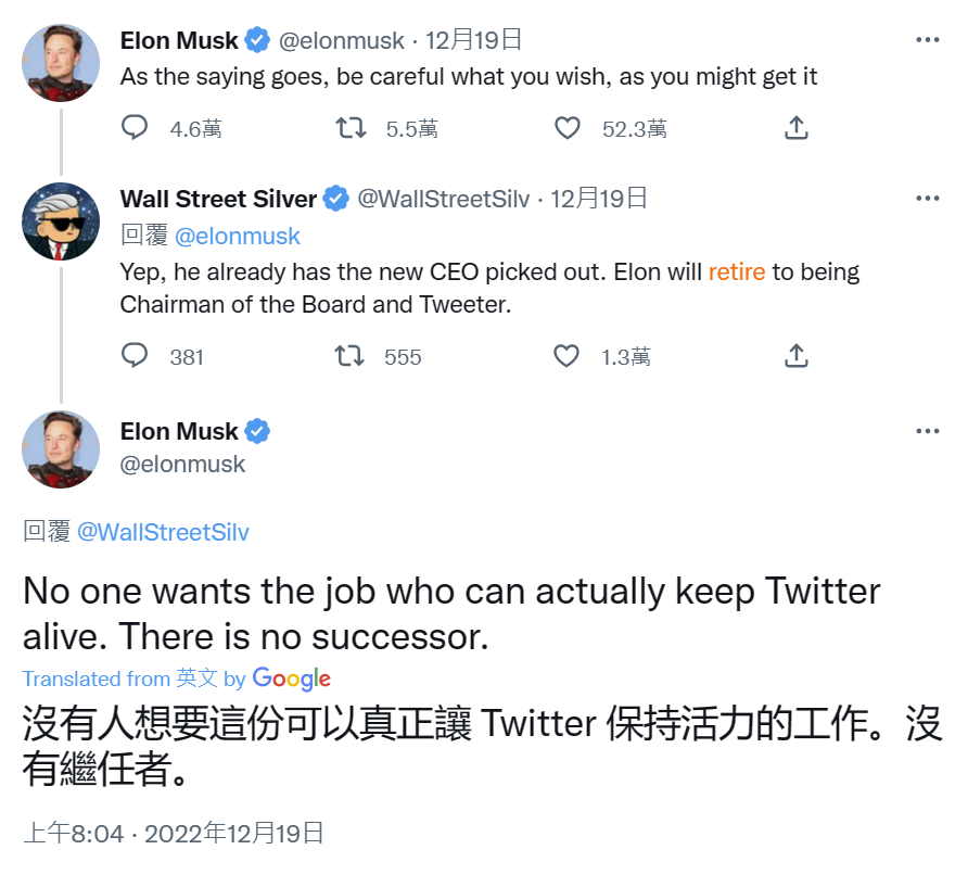 按照马斯克的「规则」,他将离开推特的负责人岗位,而在稍早前的另一条推文评论中,马斯克「抱怨」道:「那些有能力让推特活下来的人都不想要这份工作。没有继任者。」