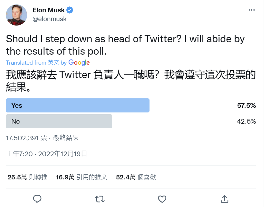截至周一投票通道关闭,超过 1750 万名用户进行了投票,结果显示 57.5% 的投票用户选择了「Yes」——马斯克应该辞去推特负责人一职。
