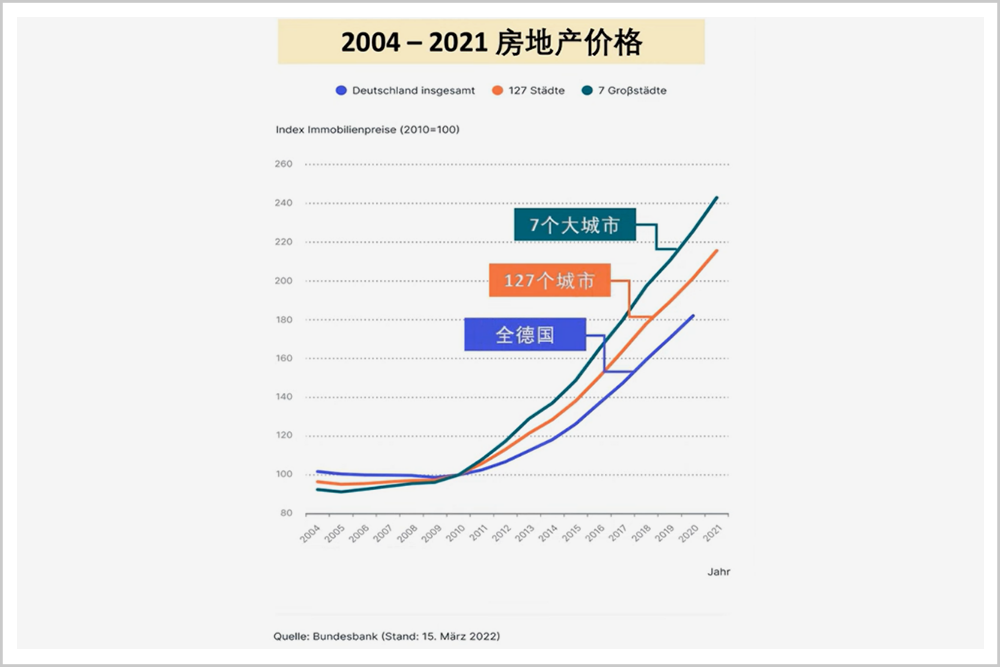 其中,像德国慕尼黑这种大城市的房价,在过去十年翻了2.5倍以上。特别是近年来,在美联储全球大放水刺激下,德国房价也迎来了一波加速上涨。