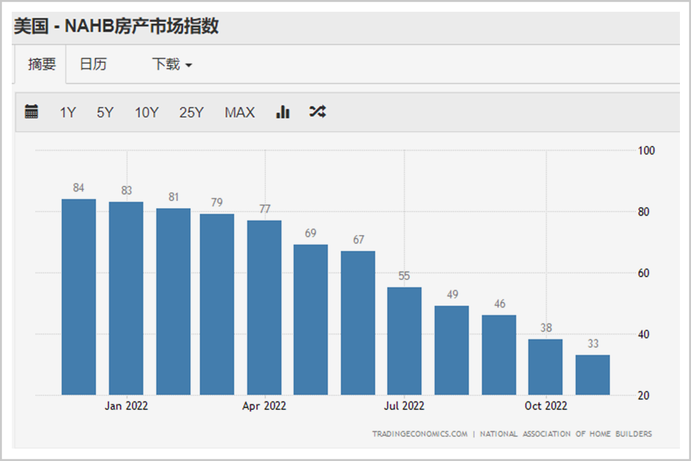 NAHB指数是美国楼市的风向标,主要针对房产建筑商的信心调查。而到了11月,这一指数进一步下跌至33点。