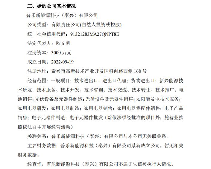 但普乐泰兴十分“年轻”。据披露,普乐泰兴成立于9月19日,注册资本为3000万元,欧文凯、向亮睿分别持有普乐泰兴99%、1%的股份。不过,普乐泰兴现有股东均尚未对公司实缴出资。普乐泰兴经营范围涉及电池销售;光伏设备及元器件制造;光伏设备及元器件销售;太阳能发电技术服务等。