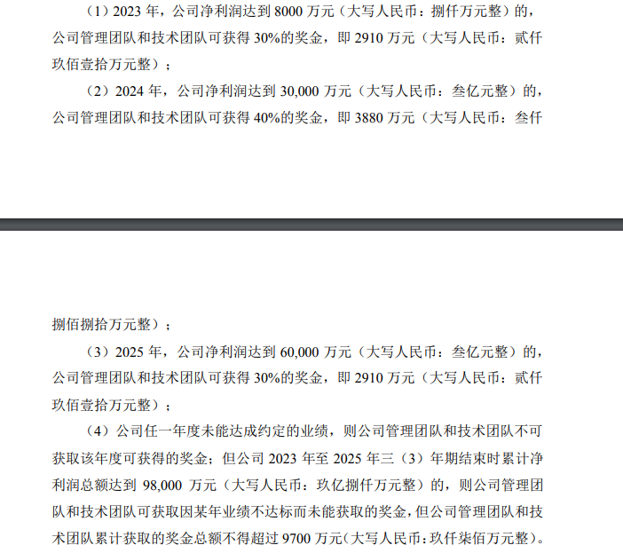 根据公告,2023年至2025年,普乐泰兴对应的业绩条件分别为8000万元、3亿元、6亿元。奖金激励之外,协议还设置了股权激励的方案。