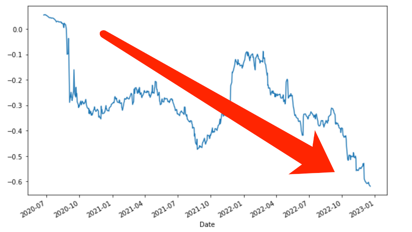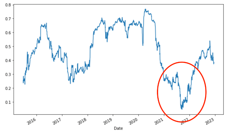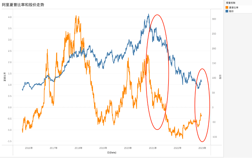 可以非常确切看到,阿里夏普比率与股价呈非常确切的正相关性。2020年末之后,阿里夏普比率急转直下,同期股价亦在迅速下行之中,近期股价和夏普比率都开始呈现上行的趋势。