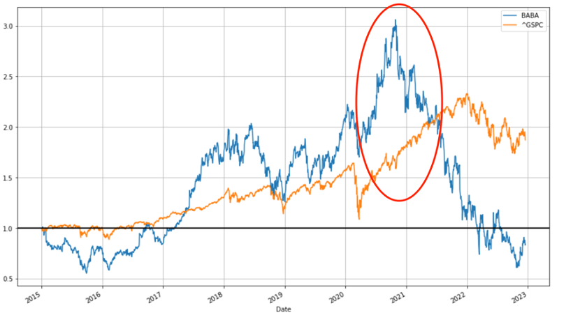我们整理了2015年至今阿里股价和标普500指数的变动情况,可以看到在大多数时间内两者都呈正相关性,也就是阿里随大盘环境的变化而起伏,直到2021年后,标普500继续在牛市中狂奔,而阿里则在监管环境调整中败下阵来,两条折线走出了差异性。