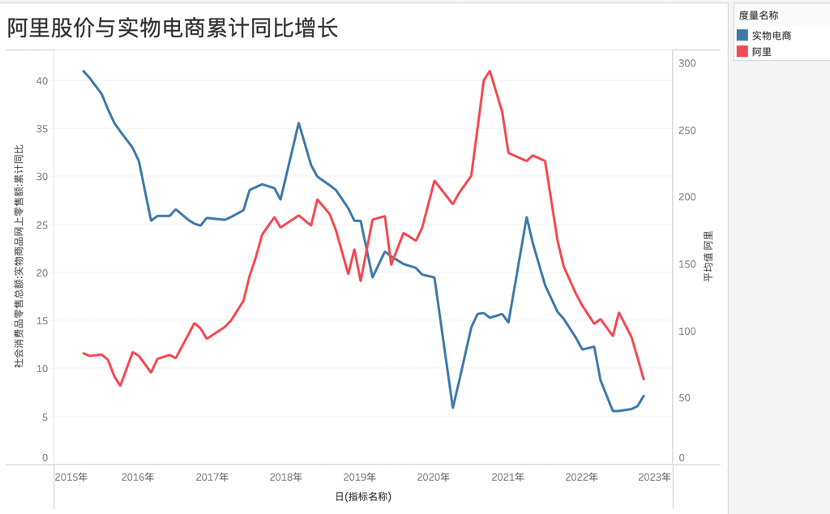 在上图中我们将我国实物电商增速与阿里股价对比,可以非常确切看到,两者呈高度的相关性,且阿里股票变化要领先于行业环境1-2个季度,也就是行业景气度会十分确切反馈在阿里股价上有所展示。