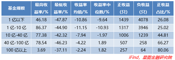 通过统计2022年不同规模公募基金收益情况,可以看出,百亿规模以上的超大型基金收益平均值最高,为-2.24%;1亿-10亿的小型规模基金收益平均值最低,为-11.15%。规模越大,基金正收益占比越高,比重分布在25%-80%之间。