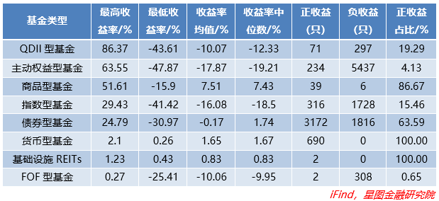 在收益回报上,根据投资类型统计了截至11月末市场上所有的公募基金在2022年的业绩表现情况。其中今年以来的收益率上限由高到低依次为QDII型(86.37%)>主动权益型(63.55%)>商品型(51.61%)>指数型(29.43%)>债券型(24.79%)>货币型(2.1%)>基础设施REITs(1.23%)>FOF型(0.27%);不过从收益率均值和中位数来看,商品型基金都要占据绝对优势,在正收益数量占比上也接近87%,位居TOP3;而主动权益型基金则垫底,正收益基金数量占比也仅高于FOF型基金;除此之外表现较好的还有货币型基金,以100%的正收益领跑所有类型的基金;债券型基金在各方面都保持了一个中等的水准。