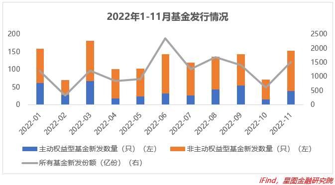 总体来看,2022年新发基金在1500只左右,远少于2021年的1947只;从数量来看,下半年要明显少于上半年,但是份额方面下半年要明显更多;其中主动权益型基金下半年基金发行数量/份额月均比重为28%/16%,上半年分别为30%/20%。2022 年1-11月,公募基金发行规模合计接近1.3万亿元,较去年同期下降50%;权益类产品发行规模占总规模的比重为24%左右。所以2022年在权益市场整体表现较差的情况下,基金市场的热度也不太高。