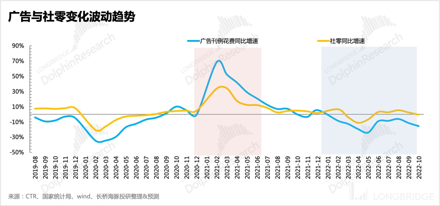 以近两年疫情下的情况为例,经济不确定性极具升高时,更能体现广告依附宏观但变动更敏感的特征:在 4Q20、2Q22 分别是早期疫情控制住后的复苏、一线城市大面积封控期,广告增速与社零增速的变动幅度均出现了较大差异。