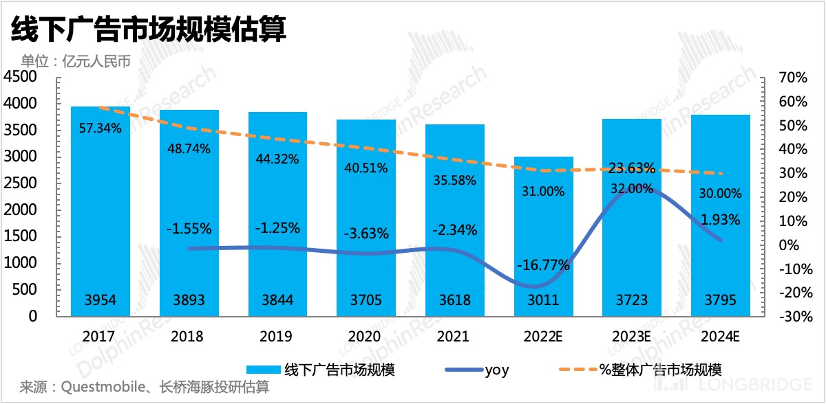 因此在度过感染高峰期之后,2023 年线下广告的 “超额” 复苏是可以期待的,海豚君乐观预计,整体市场规模预计有望超过 2020 年的水平。