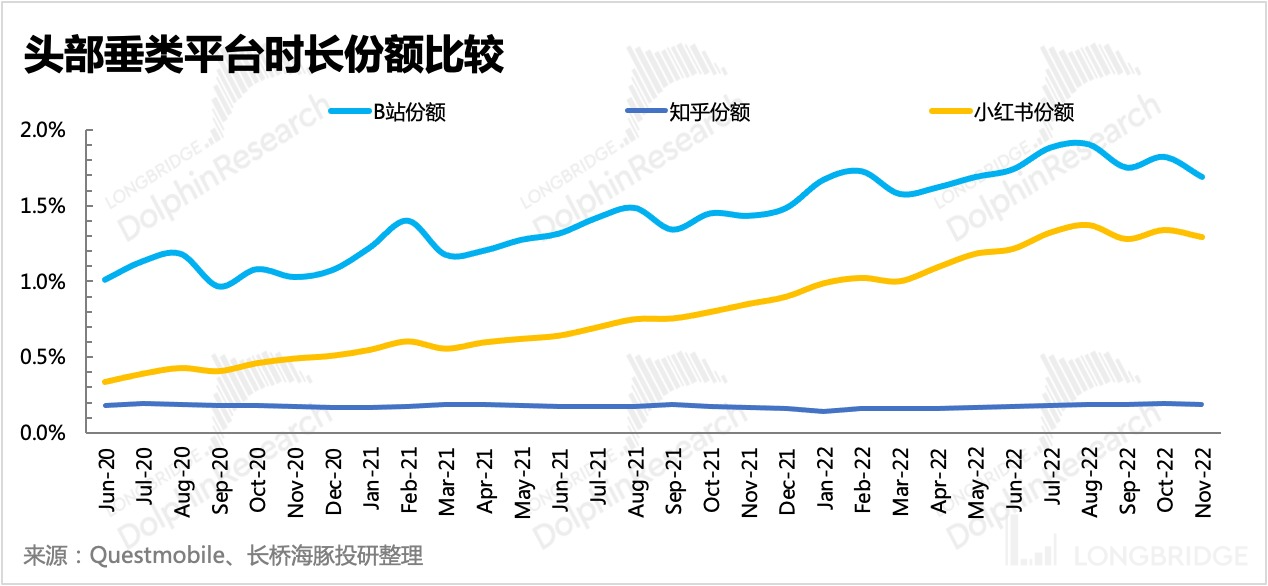5)新兴垂类渠道中,B 站、小红书的时长份额还在增长,知乎勉强回到往年巅峰,但天花板肉眼可见,破圈太难。