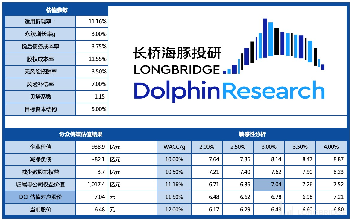 根据以上假设调整后,在 WACC=11.16%,g=3% 下,海豚君对分众中性预期下 DCF 估值为 935 亿元的市值,对应 2023 年 47 亿净利润约 19x PE。从历史估值区间来看,市场情绪乐观时,forward PE 也有希望上冲 25x,对应 1230 亿市值。