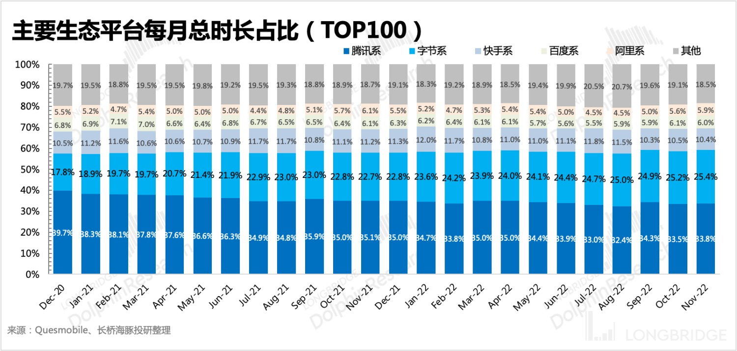 根据 Questmobile 数据(最新时长排名前 100 的 App),海豚君估算出了各龙头互联网生态的时长份额,主要看今年以来的流量变化。